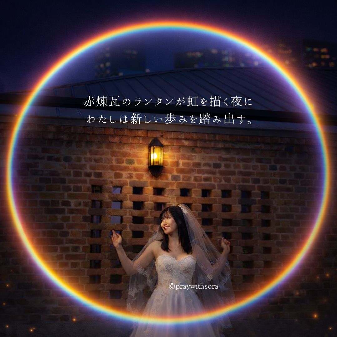 ランタンが夜の煉瓦を照らし出し、そこに浮かび上がる夜虹(やこう)が、静かに彼女を祝福している。